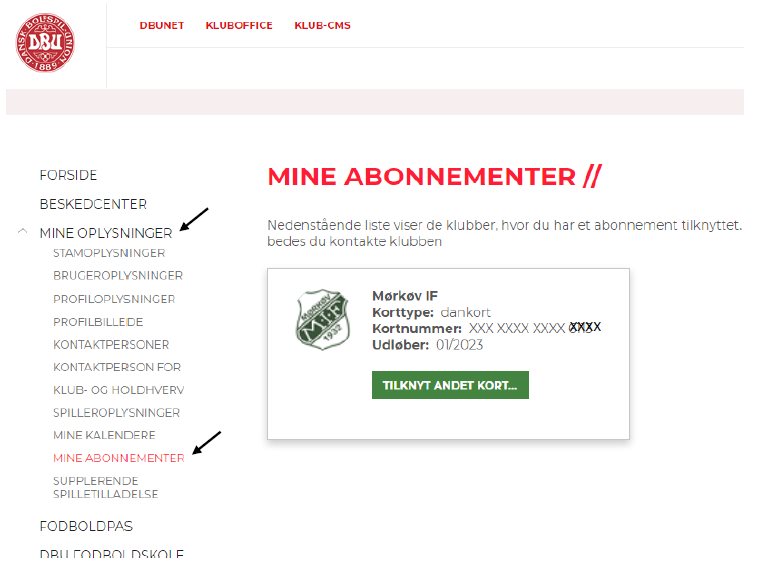 Log ind på Mit DBU og gå til "Mine oplysninger", vælg "Mine abonnementer" og du kan kun nu se det/de betalingskort som er tilknyttet dig som medlem af en klub. Kan du ikke se et betalingskort, så er der ikke tilknyttet et betalingskort til dit medlemskab i klubben.